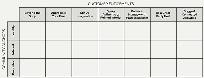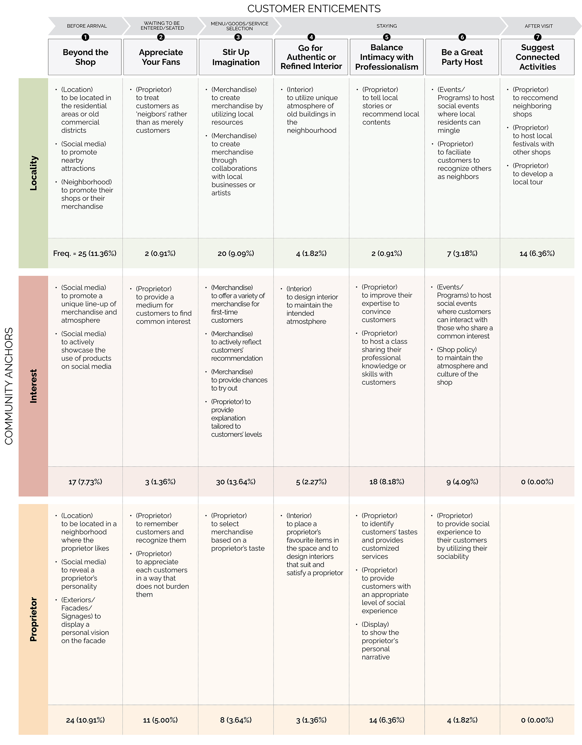 Therefore, we developed a conceptual framework that contained the two sets of categories from the literature: Customer Enticements and Community Anchors, in columns and rows, respectively, to identify the service touchpoints that fall under both categories (see Figure 1).