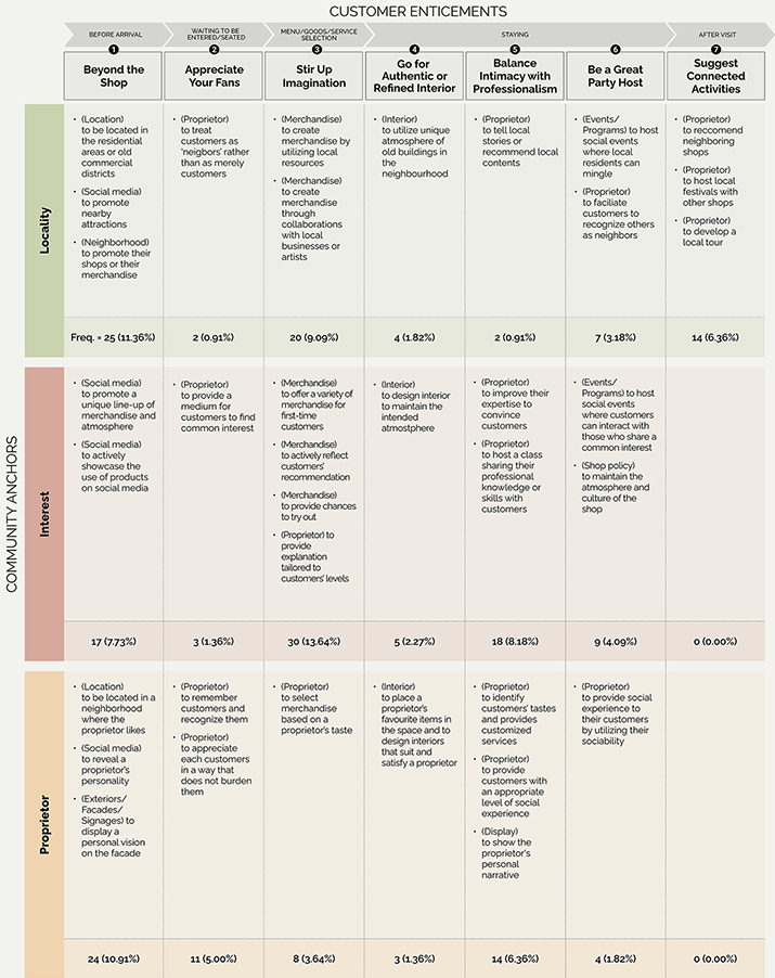 While large retail organizations proactively design, organize, and deploy service touchpoints for intended experience (Bitner et al., 2008; Verhoef et al., 2009; Zeithaml et al., 2018), small local shops often lack the resources and expertise to do so, given that they are typically owned and managed by one person (Cadden, 2012; Megicks & Warnaby, 2008). Therefore, the proprietor is left to fend for themselves and make do with whatever touchpoints they happen to have for any community-related experience. In other words, the proprietor serves as both the service provider and the “silent” service designer (Gorb & Dumas, 1987) simultaneously. To better support their efforts through service design, it is necessary to understand how they utilize service touchpoints and enhance them through expert design facilitation. A systematic examination of the community-anchored service touchpoints currently in use can be effectively conducted with a conceptual framework that identifies how customers can be enticed into the shop in a way that fosters a sense of community.