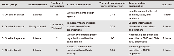 In practice, transformative work is carried out by professionals working both within and outside public organizations. We aimed to capture both perspectives and therefore conducted two focus groups with primarily external professionals and two focus groups with internal professionals. Differences in region, domain, size, and function of public organizations matter when engaging in transformative work. We wanted to cover this variety and selected participants accordingly. All participants, however, were mainly working with(in) Dutch public organizations. Moreover, the participants in each group were in one way or another professionally related. This was to ensure that the participants felt comfortable sharing their perspectives, could relate to one another’s experiences, and spoke the same language (Kleiber, 2003).