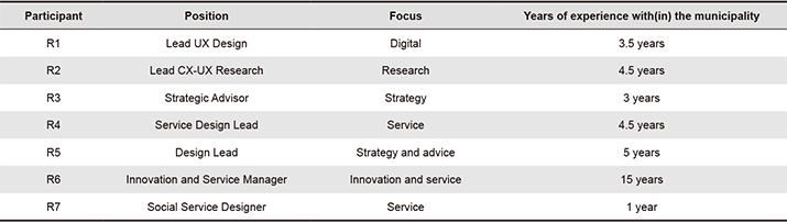 Participants were selected in close collaboration with one of the in-house designers who has been part of and involved in the transformation that the municipality has undergone in the past nine years. The in-house designer introduced the first author to six other colleagues who have played a crucial role in this transformation; see Table 2 below for an overview.