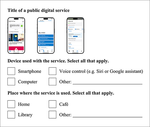 The earlier public sector project, “Multi-sited digital support for city residents,” which provided some background information for the study reported in this paper, aimed to develop a service model for Espoo and Vantaa to offer better access to digital support services and improve citizens’ digital skills. Developing the service model involved citizen consultation, a typical approach for public sector development activities (Design Council, 2013). According to Pirinen et al. (2022), many governments and cities worldwide use citizen-centered and collaborative design approaches to address the complex challenges in the public sector, driven by demographic, social, environmental, and economic change. However, this previous project did not explicitly incorporate any elements drawn from design fields, so we aimed to explore how our design expertise could assist the cities with these challenges. The citizen consultation of the project focused on five groups of people: 1) youth (11-24 years old), 2) working citizens, 3) retired citizens, 4) long-term unemployed citizens, and 5) immigrants. The residents’ needs and views regarding digital support were gathered through an online survey (n = 668), mail surveys (n = 286), and phone interviews (n = 50). The results highlighted that older and retired residents, in particular, require digital support and would prefer to receive it in person (Espoo Esbo & Vantaa, 2023; Koskimies et al., 2021). Despite this earlier project having produced some interesting results and suggesting improvements mainly to existing services (see Tables 1 and 2), the city officials emphasized the need for a deeper understanding of how older people interact with digital technologies and digital public services in their daily lives.
