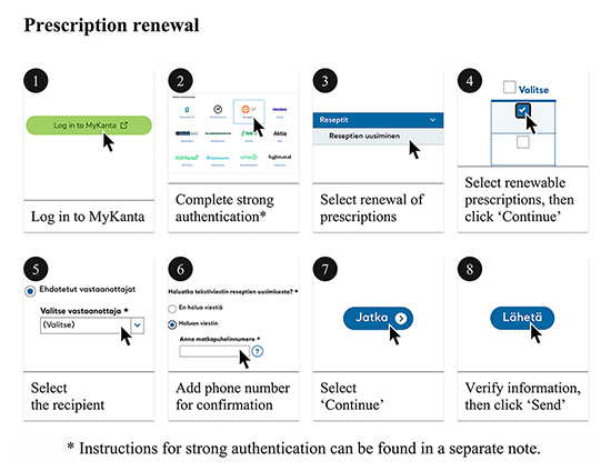 We can draw several more practical design implications from our study: some of the most prevalent examples are presented below. The first idea we present is primarily related to technical and operational skills: we suggest designing visual, step-by-step instructions for important matters. Studies indicate that older individuals require increased repetition to retain the knowledge and skills necessary for performing online tasks. This finding is consistent with the research conducted by Korjonen-Kuusipuro et al. (2021), which suggests that older individuals may require additional time and effort to acquire new skills. To promote the digital literacy of older individuals and empower them to acquire knowledge autonomously, digital support services could offer detailed and sequential guidance on how to perform specific tasks within digital platforms. These instructions enable older citizens to independently practice and participate at home, thereby enhancing their digital abilities and self-reliance. The choice of assigned tasks should be based on research into the typical internet activities carried out by older citizens, such as implementing robust authentication measures in banking services, communicating with healthcare providers, refilling medical prescriptions, and scheduling doctor appointments. This practical suggestion is partly inspired by the visual aids we used in the interviews, as they worked very well (Figure 5). presents an example of such step-by-step instructions for renewing prescriptions in digital service OmaKanta.