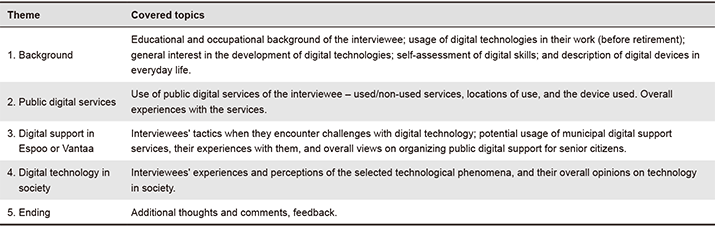 These encounters made us understand two things: Firstly, we had severely overestimated our understanding of how older adults experience digitalization in their everyday lives, especially how they experience being marginalized by technical development as digitalized services become inaccessible for them; secondly, our hypothesis concerning that there was a dire need to redesign digital support services was correct. In other words, we had recognized the phenomenon, but our ideas on how to engage with older adults did not work. Thus, we took a step back and deemed that individual, in-depth theme interviews are needed to provide a more solid understanding of the everyday digital experience of older adults living in Espoo and Vantaa, and to redefine our design problem(s) and subsequent approaches. Thus, we decided to draw more from design anthropology, which emphasizes an ethnographic approach and the meaning of contextual and theoretically informed understanding as a basis for design activities (e.g., Gunn et al., 2020).