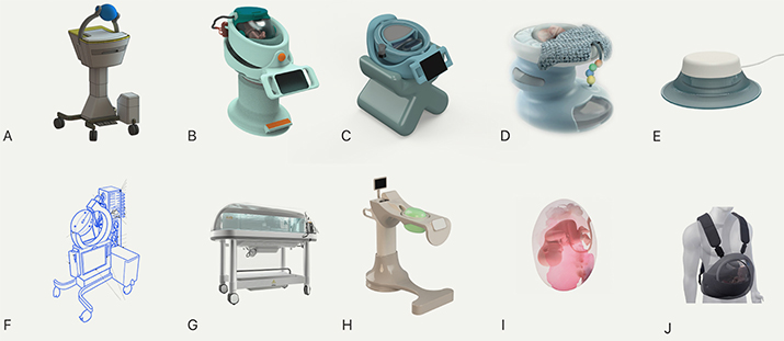 The design approach (see Figure 1) resulted in several design ideas, sketches, and small-scale physical design prototypes. To include in the surveys, interviews, and focus group interviews, several designs from our and external research groups were shown. The iterations of this study did not aim to arrive at a final design prototype but rather to explore a range of design concepts. The concepts synthesized different design priorities; the scenarios supported by the prototype aim to encourage debate on a clinically and technically plausible design direction preferred by stakeholders. The (non-functional) prototypes differed in concept, material, interaction possibilities, visibility of the infant, user scenarios, geometry, and color to elicit reactions. Refer to Figure 3 for an overview of the concepts included in the surveys and focus group interviews.