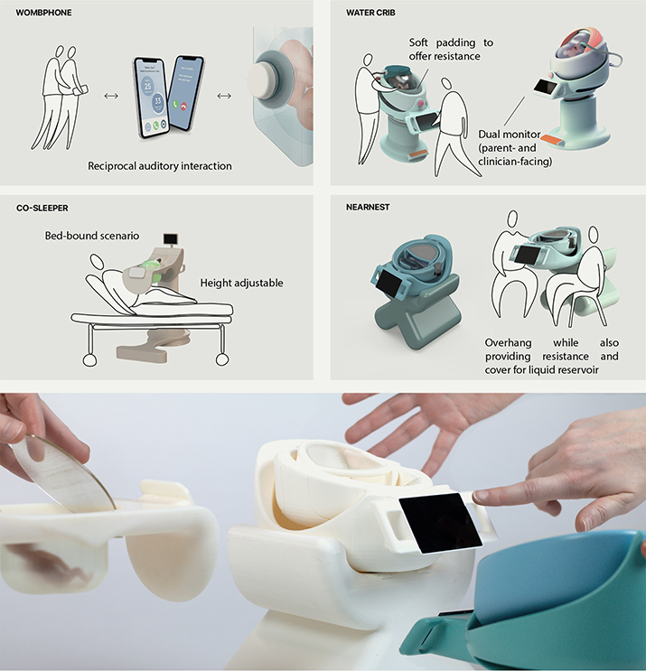 - A full-system design. The reservoir is equipped with soft padding that may move and emit sounds resembling the maternal environment. It features height adjustability and extension capabilities for positioning over a hospital bed or for more comfortable parental seating. Parts of the crib surrounding the reservoir are detachable, facilitating parental touch (Design by Wijen, M. and Kuijpers, R.).
