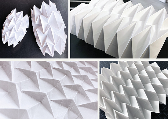 dynamic structures that use the (clockwise from top left) waterbomb, Kresling, Miura, and Resch triangle folds.