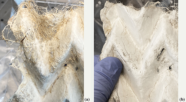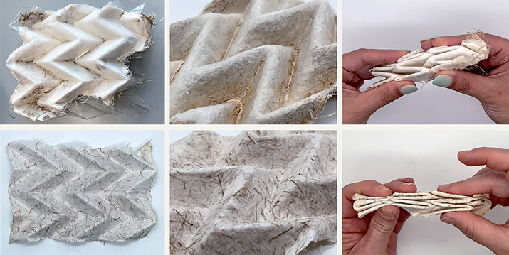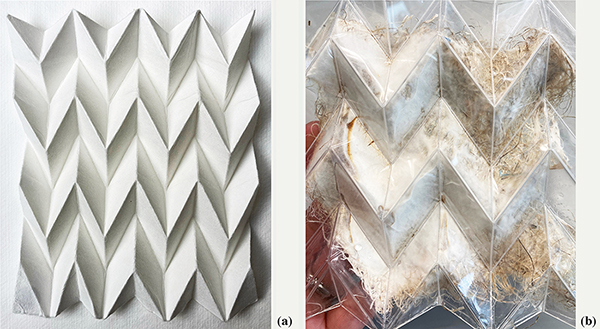 In the project, constructing molds to form the Miura tessellations provided one of the richest opportunities for negotiating among actors and processes. Both inoculated paper sheets and carded fiber substrates were placed into the matrices we created, allowing the mycelium to grow into dynamic, three-dimensional tessellations. Digital fabrication techniques were invaluable for this process, and we utilized two types of matrix-style molds with conjoining top and bottom elements: 3D-printed molds made with PLA and laser-cut molds made with Vivak. The initial prototypes for each mold were created with standard digital fabrication guidelines in mind, including the preservation of material and optimization of the 3D printing process. It became clear, however, that the molds needed to be designed with input from both biofabrication and craft perspectives to produce amenable conditions for mycelium, as well as to support the tessellated structures we hoped to grow (Figure A8). Early 3D-printed molds were too light to press the growing mycelium sufficiently, and the Miura unit cells were overly shallow, inhibiting elasticity and dynamic growth in the resulting structures. Creasing the laser-cut Vivak into Miura patterns proved untenable unless thicker material and heat were applied, and the thicker material in turn suffocated mycelium growth. In the context of a shared design process, these “failures” were, in actuality, moments of opportunity to reflect on how tools, techniques, and perspectives could entangle, rather than forcing the considerations of one domain onto the others (Figure 9).