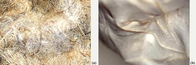 (a) forming a white “fuzz” on carded hemp fibers, and (b) the same structure under the microscope.