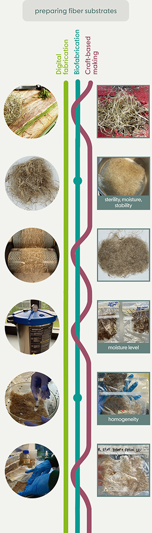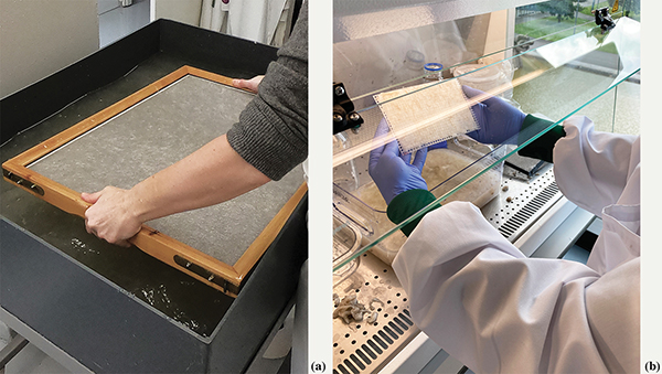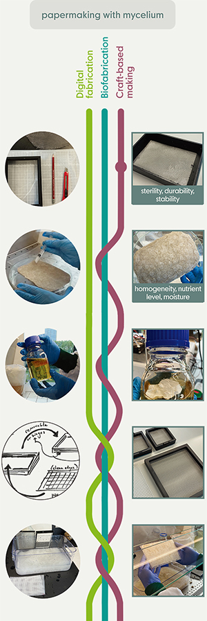 There is perhaps no better example of the benefits of combining (seemingly) disparate processes than papermaking with mycelium. Initial testing showed that prefabricated paper sheets inoculated with mycelium produced uneven growth, underscoring the need to create a homogeneous mixture of pulp and mycelium inoculant, as well as to adapt the papermaking process for mycelium. At the outset, we taught each other our respective crafts: trading expertise as we shared how to prepare mycelium mother cultures and inoculate substrate, and how to process cellulose pulp and pull paper sheets. However, entangling mycelium cultivation with papermaking posed numerous challenges from the start. Mycelium requires a sterile inoculation environment and is particularly sensitive to moisture during the growth stage. Laboratory inoculation takes place inside a contained ventilator, which maintains airflow while minimizing the possibility for contamination. Papermaking, on the other hand, tends to be an expansive process that flows freely between pulp beater, water basin, and press. Combining the two required a collective rethinking of conventional techniques, necessitating an approach—a negotiation—that could move beyond solely biofabrication or craft (Figure A5).