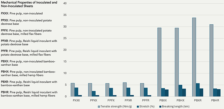 Figure A12. Tensile strength, stretch, and breaking length in inoculated and non-inoculated sheets.