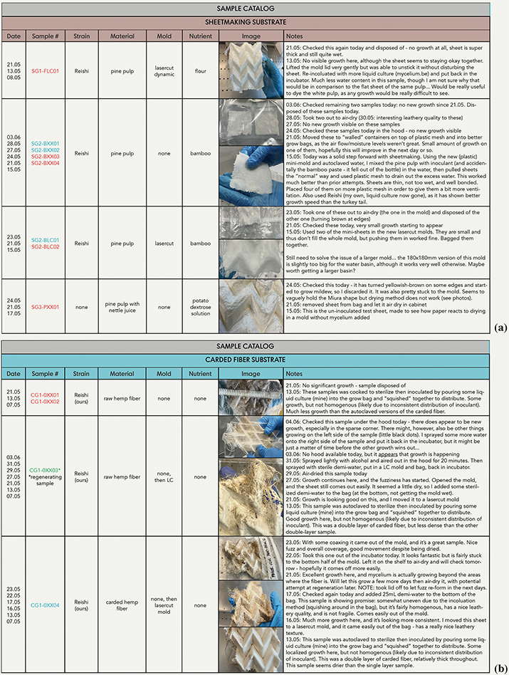 While we were working towards an ultimate objective (growing dynamic tessellations with mycelium composites), the nature of how we would achieve that aim remained in flux, and we could not foresee where impactful design events or moments of negotiation would occur. Accordingly, the structure and function of our documentation had to be holistic by design. We implemented methods that would capture diverse snapshots of both processes and artifacts: laboratory notes (Figure A10), a shared project diary (Figure A3), a comprehensive sample catalog (Figure A4), video footage (Table A1) and photographs (Figure A9) of laboratory procedures and samples, and a series of workflow instructions for project activities as they developed.