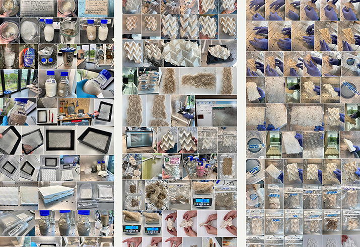 Our next step was to use the inoculated pulp to create sheets through which the mycelium would grow into tessellated structures. In papermaking, the mold and deckle are submerged in a diluted pulp-water mixture, resulting in a distribution of fibers that are drained and removed from the screen. These fibers are then pressed and dried to form sheets. Early prototypes of our mold and deckle for mycelium sheets utilized a traditional wooden frame and cloth mesh, as well as a pour-mold style construction (Figure A6). These efforts were guided by papermaking standards and reflected minimal biofabrication input. We soon discovered that the resulting sheets were not only too wet to support mycelium growth but also highly susceptible to contamination. In response, we speculated on the needs of mycelium and how we might better address them: the mold and deckle should be sterilizable to avoid contamination, deconstructable to ease the removal of newly-pulled sheets in a small workspace, and inclusive of a solution for mitigating excess water retention.
