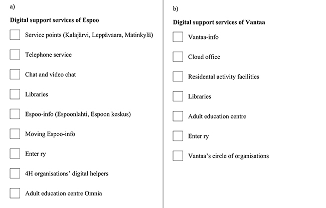 Figure 3. List of municipal digital support services in a) Espoo and b) Vantaa.