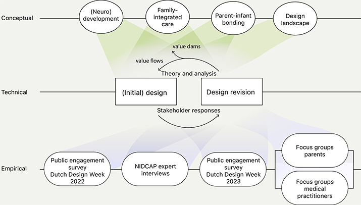 As previously argued by Verweij et al. (2021), an integrated approach is needed, where insights from the medical and technical fields are combined with those from medical ethics, parents (of extremely premature infants), parent advocate groups, and public opinion. The connection between technical, medical, and patient requirements, on the one hand, and parental and societal values, on the other hand, has not been described and integrated from a design perspective in APAW research before. This study focuses on the process of stakeholder involvement by collecting (design) requirements through a value-sensitive design approach. Where co-design, co-creation, and participatory design focus on stakeholder collaboration throughout the design process, value-sensitive design emphasizes a structured approach to embed these values explicitly in the technology’s design. Using value-sensitive design methods enables the prioritization and alignment of diverse stakeholder values, promoting responsible outcomes and technology acceptance among its intended user groups. We employed a tripartite methodology that combines conceptual, empirical, and design investigations iteratively (Friedman & Hendry, 2019). The design concept sketches and prototypes presented in this study aim to explore the potential implications of new technologies, identify overlooked aspects, engage stakeholders, and ultimately guide the development of preferable futures, rather than merely serving as functional prototypes. Using prototypes helps to identify the difference between what people say they do or value (declared practices) and what people actually do or value when they see or use a prototype (real practices), also known as theory-in-use (Friedman & Hendry, 2019). Therefore, this approach encourages participants to reflect on (physical) attributes and experiential needs that might previously have been unarticulated, and to provoke cognitive reactions that can be further explored (Forlizzi et al., 2003; Norman, 2004). They may help reveal new opportunities and potential tensions between stakeholders, such as parents and clinical staff.