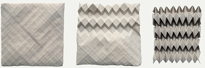 dynamic structures that use the (clockwise from top left) waterbomb, Kresling, Miura, and Resch triangle folds.