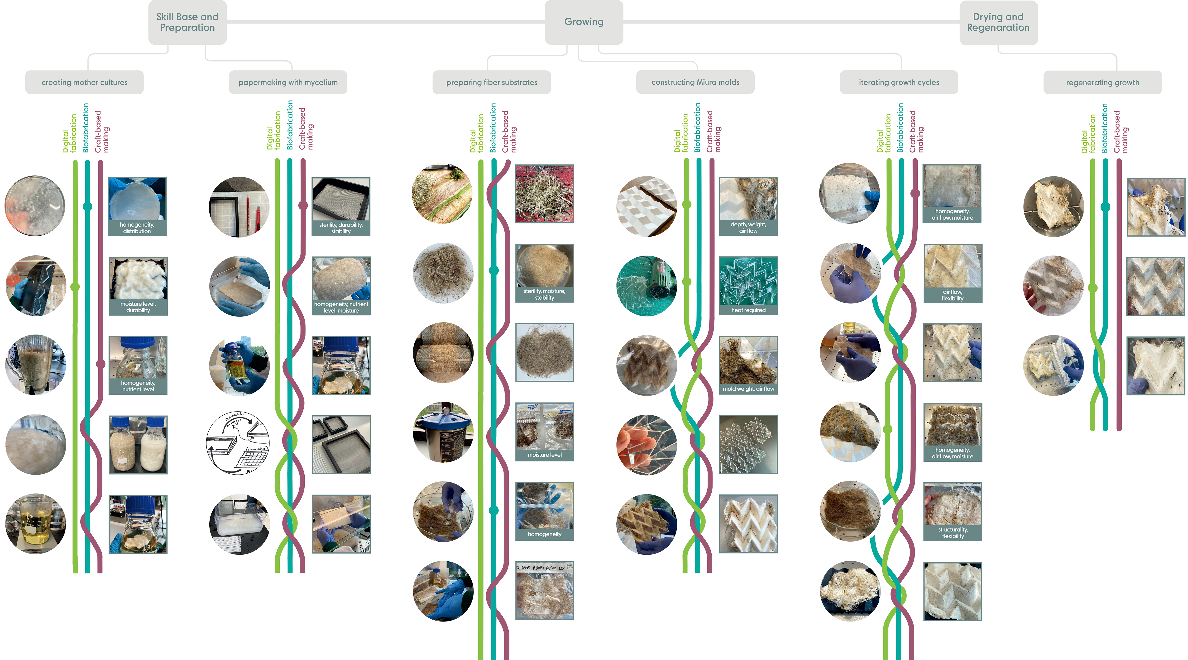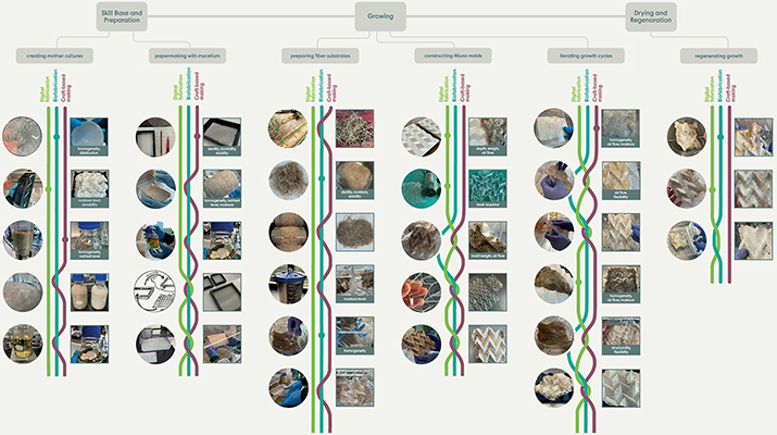 This meshwork and the flux in which it operates are part of a living design process, as described by Alexander (2002b): “the nature of order is interwoven in its fundamental character with the nature of the processes which create the order” (p. 2). In the work presented here, diverse techniques, tools, and perspectives converge to collectively shape events and their subsequent artifacts. By combining conventional making practices with interdisciplinary approaches focused on growing as a mode of designing-with, we engage with the contingency of growing tessellations: a living design process that entangles the diverse processes of craft-based making, digital fabrication, and biofabrication, as well as their corresponding techniques and tools (Figure 3).