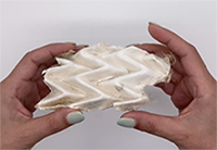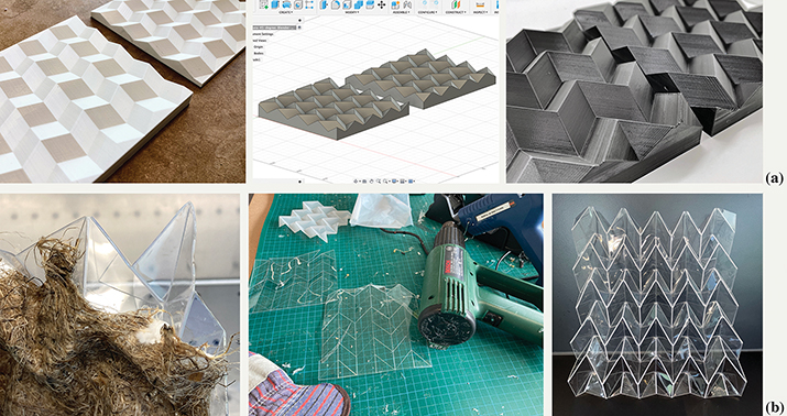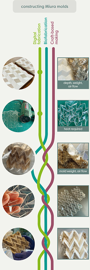 In the project, constructing molds to form the Miura tessellations provided one of the richest opportunities for negotiating among actors and processes. Both inoculated paper sheets and carded fiber substrates were placed into the matrices we created, allowing the mycelium to grow into dynamic, three-dimensional tessellations. Digital fabrication techniques were invaluable for this process, and we utilized two types of matrix-style molds with conjoining top and bottom elements: 3D-printed molds made with PLA and laser-cut molds made with Vivak. The initial prototypes for each mold were created with standard digital fabrication guidelines in mind, including the preservation of material and optimization of the 3D printing process. It became clear, however, that the molds needed to be designed with input from both biofabrication and craft perspectives to produce amenable conditions for mycelium, as well as to support the tessellated structures we hoped to grow (Figure A8). Early 3D-printed molds were too light to press the growing mycelium sufficiently, and the Miura unit cells were overly shallow, inhibiting elasticity and dynamic growth in the resulting structures. Creasing the laser-cut Vivak into Miura patterns proved untenable unless thicker material and heat were applied, and the thicker material in turn suffocated mycelium growth. In the context of a shared design process, these “failures” were, in actuality, moments of opportunity to reflect on how tools, techniques, and perspectives could entangle, rather than forcing the considerations of one domain onto the others (Figure 9).