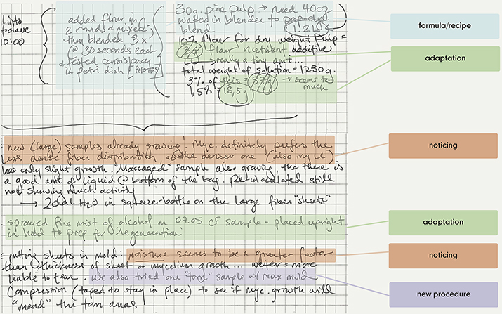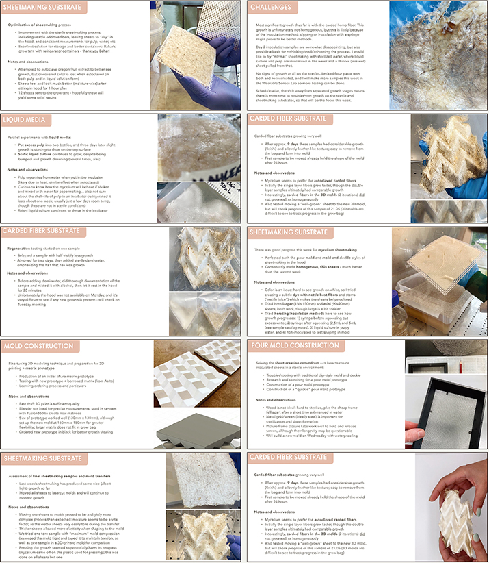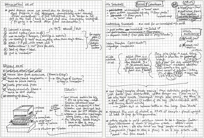 While we were working towards an ultimate objective (growing dynamic tessellations with mycelium composites), the nature of how we would achieve that aim remained in flux, and we could not foresee where impactful design events or moments of negotiation would occur. Accordingly, the structure and function of our documentation had to be holistic by design. We implemented methods that would capture diverse snapshots of both processes and artifacts: laboratory notes (Figure A10), a shared project diary (Figure A3), a comprehensive sample catalog (Figure A4), video footage (Table A1) and photographs (Figure A9) of laboratory procedures and samples, and a series of workflow instructions for project activities as they developed.