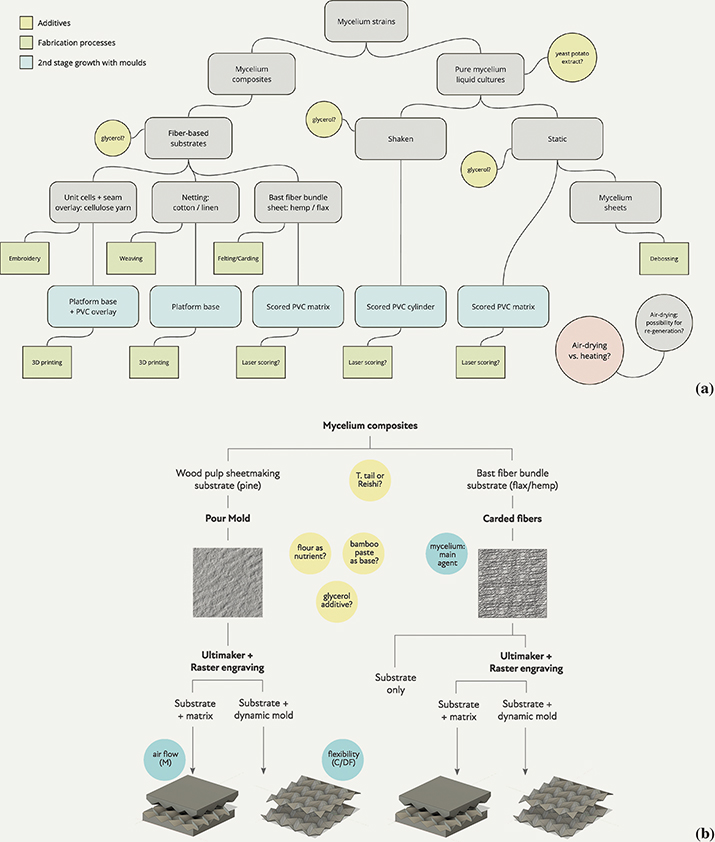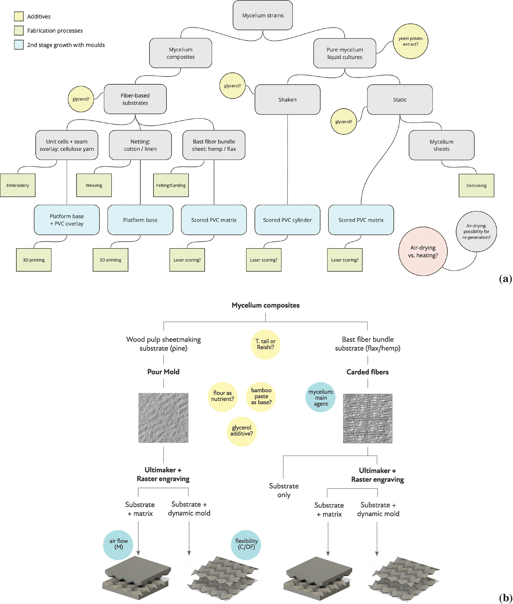The ability to shape mycelium, combined with its flexible structure when cultivated homogeneously, makes it a particularly well-suited material for growing dynamic tessellations. However, the choice was not purely mechanical. Aligning with the relational nature of affordances as materials potential (Barati & Karana, 2019), our unique backgrounds as practitioner-researchers played a crucial role—bringing together the knowledge and skills of working with mycelium in the lab as well as crafting with plant fibers and alternative sources of cellulose (an ideal substrate for mycelial growth). The intertwining of expertise enabled a prospective search for commonalities amongst materials, practices, media, and techniques that pushed beyond practitioners’ intuition. Taken together, the authors’ situated knowledge and the bridging role of mycelium allowed for a sharper analytical focus on emergent possibilities arising from the entanglement of our shared capabilities, materials included (c.f., Barati & Karana, 2019).