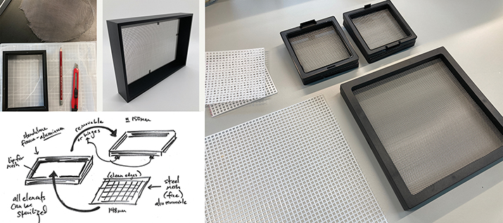 Our next step was to use the inoculated pulp to create sheets through which the mycelium would grow into tessellated structures. In papermaking, the mold and deckle are submerged in a diluted pulp-water mixture, resulting in a distribution of fibers that are drained and removed from the screen. These fibers are then pressed and dried to form sheets. Early prototypes of our mold and deckle for mycelium sheets utilized a traditional wooden frame and cloth mesh, as well as a pour-mold style construction (Figure A6). These efforts were guided by papermaking standards and reflected minimal biofabrication input. We soon discovered that the resulting sheets were not only too wet to support mycelium growth but also highly susceptible to contamination. In response, we speculated on the needs of mycelium and how we might better address them: the mold and deckle should be sterilizable to avoid contamination, deconstructable to ease the removal of newly-pulled sheets in a small workspace, and inclusive of a solution for mitigating excess water retention.