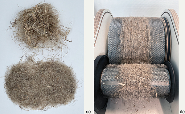 Figure A7. Carding hemp: (a) raw hemp pictured above carded fibers; (b) the mechanical carding process.