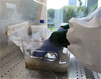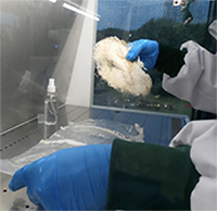 There is perhaps no better example of the benefits of combining (seemingly) disparate processes than papermaking with mycelium. Initial testing showed that prefabricated paper sheets inoculated with mycelium produced uneven growth, underscoring the need to create a homogeneous mixture of pulp and mycelium inoculant, as well as to adapt the papermaking process for mycelium. At the outset, we taught each other our respective crafts: trading expertise as we shared how to prepare mycelium mother cultures and inoculate substrate, and how to process cellulose pulp and pull paper sheets. However, entangling mycelium cultivation with papermaking posed numerous challenges from the start. Mycelium requires a sterile inoculation environment and is particularly sensitive to moisture during the growth stage. Laboratory inoculation takes place inside a contained ventilator, which maintains airflow while minimizing the possibility for contamination. Papermaking, on the other hand, tends to be an expansive process that flows freely between pulp beater, water basin, and press. Combining the two required a collective rethinking of conventional techniques, necessitating an approach—a negotiation—that could move beyond solely biofabrication or craft (Figure A5).